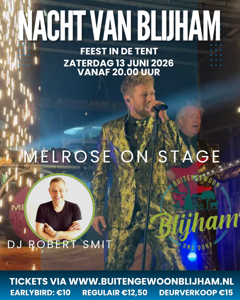 PRGRAMMA! FEESTWEEK BLIJHAM 2026 vrijdag 12 t/m zondag 21 juni Zaterdag 13 juni: Nacht van Blijham 20.00 - 02.00 uur De ”Nacht van Blijham” is terug van weggeweest! Dit jaar in de tent op zaterdag 13 juni MELROSE ON STAGE! & DJ Robert Smit! Locatie; Feesttent, Grasveld Omloop Kaarten bestellen